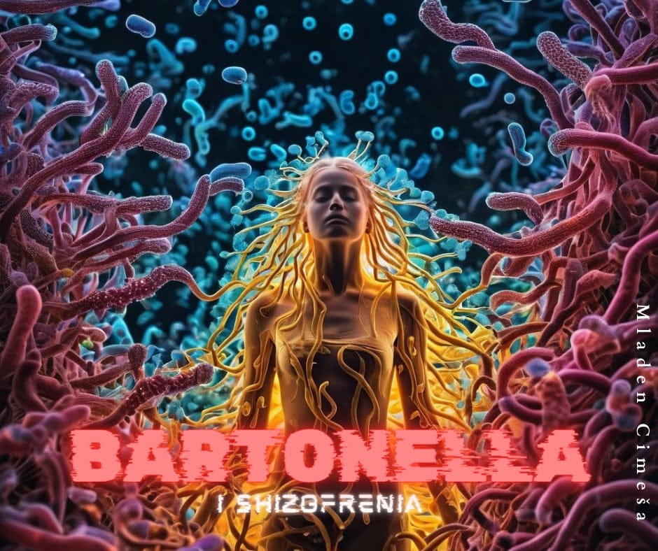 Riječ Bartonella, možda na prvu pomisao podsjeća na neku italijanski hranu , eventualno neki koktel , ili hajde da budemo kreativni, neki brend cipela sa Apenina, ali na žalost ostaćemo razočarani, jer Bartonella to nije. Bartonella je gram-negativna bakterija , koja je nedavno privukla pažnju u psihijatrijskim istraživanjima zbog svoje potencijalne konekcije sa shizofrenijom . Vrste Bartonella, za koje se zna da izazivaju infekcije poput bolesti mačjih ogrebotina i rovovske groznice, obično se prenose putem vektora kao što su buhe, uši i krpelji. Iako su ove infekcije često povezane s febrilnim bolestima i vaskularnim proliferacijama, novi dokazi ukazuju na moguću povezanost između infekcija Bartonella i neuropsihijatrijskih poremećaja, uključujući shizofreniju. Što se tiče mikroorganizama pored Bartonelle u epiopatogenezi psihijatrijskih odnosno mentalnih poremećeja možemo izdvojiti I Toxoplasmu gondii i Cytomegalovirus.